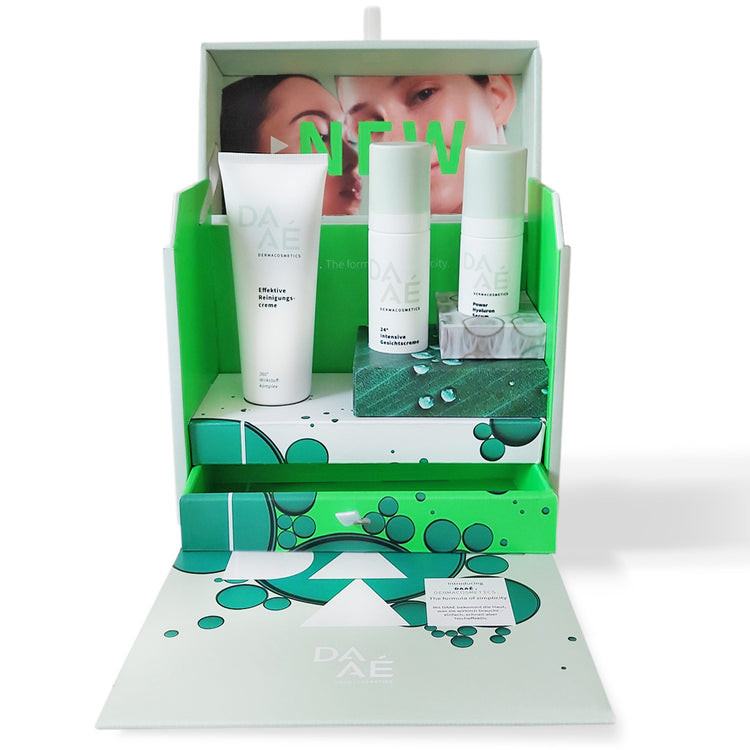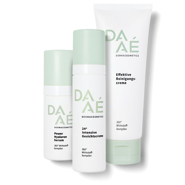 Das Herzstück der DAAÉ Gesichtspflege ist ein wissenschaftlich fundierter 360° Wirkstoffkomplex, bestehend aus vier Leitwirkstoffen, die Ihre Haut pflegen, beruhigen, ausbalancieren, liften, stärken und verjüngen.